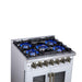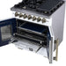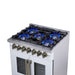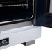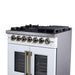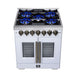 The Forno Capriasca 30 Inch French Door Dual Fuel Range in white with antique brass accessories brings professional-grade style and performance into your kitchen. Its signature French doors open outward to provide up to 12 inches of extra clearance, giving you easier access to the oven. The gas cooktop features five sealed dual-ring brass burners with a powerful 100,000 BTU total output, including a 20,000 BTU burner perfect for rapid boiling, high-heat searing, or gentle simmering of sauces and melted chocolate. Heavy-duty cast iron grates span the surface for maximum stability and smooth movement of cookware, while the recessed enamel cavity helps contain spills for effortless cleaning. Inside, the 4.32 cu. ft. electric oven delivers 6,300 watts of cooking power with true convection technology, ensuring fast, precise, and consistent results. A speckled blue enamel interior adds durability and easy maintenance, while the triple-layer glass oven door window provides clear visibility without sacrificing heat retention. The Capriasca also includes premium accessories: three stainless steel telescopic oven racks, an LP conversion kit, wok ring, reversible griddle, rotisserie kit with skewers, and an air fry basket with rack and drip pan.
