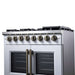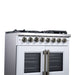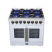 The Forno Capriasca 36 Inch French Door Dual Fuel Range in white with antique brass accessories brings professional style and high performance cooking into your home kitchen. Its signature French doors open outward, providing up to 12 inches of extra clearance for easier oven access. The range top features six sealed dual-ring brass burners with a powerful 120,000 BTU total output, offering the flexibility to achieve both intense searing and delicate simmering for sauces or melted chocolate. Heavy duty continuous cast iron grates ensure stability and smooth movement of cookware, while the recessed enamel cooktop cavity contains spills for easy cleanup. Inside, the 5.36 cu. ft. true convection oven delivers 6,300 watts of cooking power for fast, precise, and consistent results. A speckled blue enamel interior enhances durability and makes maintenance simple, while the triple-layer glass oven door window allows clear visibility without losing heat. Every detail is designed for performance and convenience, with included accessories such as an LP conversion kit, three stainless steel telescopic oven racks, wok support, reversible griddle, rotisserie kit with skewers, and an air fry basket with rack and drip pan.