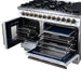 The Forno Capriasca 48 Inch French Door Dual Fuel Range in white with antique brass accents combines professional styling with powerful performance for the home kitchen. Its French door design provides up to 12 inches of extra clearance, making it easier to load and access the oven. The cooktop is equipped with eight sealed dual-ring brass burners delivering a total of 160,000 BTU, offering precise control for everything from high-heat searing to gentle simmering. Heavy-duty continuous cast iron grates keep cookware stable and allow smooth movement across the recessed enamel cooking surface, which helps contain spills for quick cleanup. The double electric ovens provide a combined 6.58 cu. ft. capacity with 9,700 watts of cooking power. Both interiors are finished in durable speckled blue enamel with triple-layer glass oven doors, while the right oven features a true convection fan for fast and even results. Premium accessories are included: six stainless steel telescopic oven racks, an LP conversion kit, wok ring, reversible grill/griddle, rotisserie kit with skewers, and an air fry basket with rack and drip pan. Zinc-coated metal knobs with bezel rings add a refined touch and long-lasting durability.