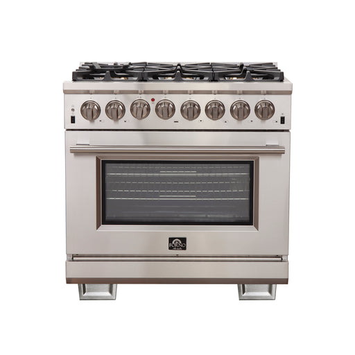 FORNOThe Forno Capriasca 36-Inch dual fuel range elevates your home kitchen with its durable 304 grade stainless steel design. Featuring 6 sealed dual-r...