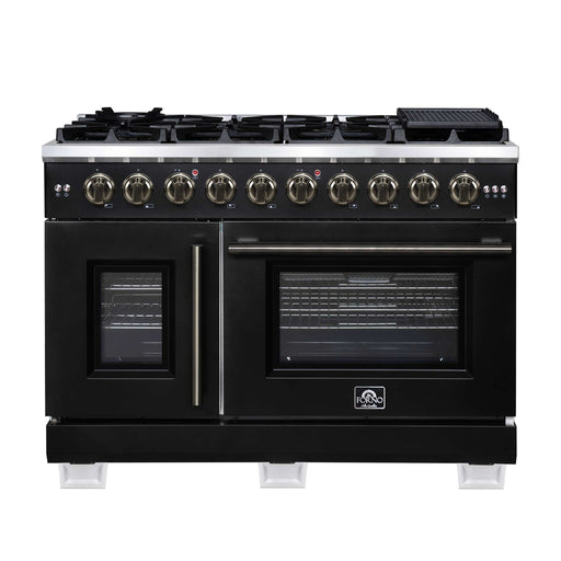 View full detailsForno Massimo 48 Inch Freestanding Dual Fuel Range in Black with Antique Brass Accessories, 8 Burners, 6.58 cu. ft. Convection Oven