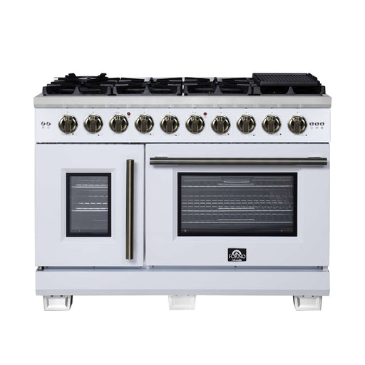View full detailsForno Capriasca 48 Inch Freestanding French Door Dual Fuel Range in White with Antique Brass Accessories, 8 Burners, True Convection Oven