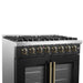 Our 36" Galiano Dual Fuel French Door Range blends timeless design and high performance. Featuring a sleek black finish and antique brass knobs, this range adds sophistication to any kitchen at an affordable price. The cooktop boasts six sealed burners with a total output of 83,000 BTU, including a 20,000 BTU dual-ring burner ideal for boiling, searing, or simmering delicate sauces. The heavy-duty cast iron grates provide a stable surface and allow you to slide cookware effortlessly across the cooktop. Its spacious 5.36 cu.ft. true convection oven delivers even heat distribution, powered by 6,300 watts, for perfectly baked and roasted dishes. Easy-to-clean black enamel interiors, French door convenience, and included electroplated racks make this range as practical as it is beautiful. Complete with an LP conversion kit and NEMA 14-50 power cord, the Galiano Range is built for both style and efficiency.