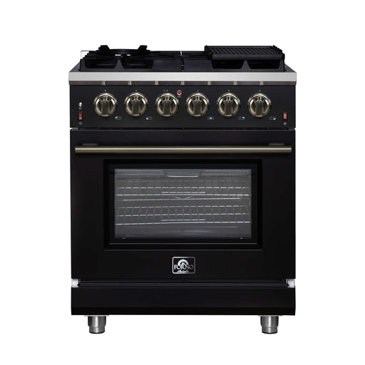 FORNOThe Forno Capriasca 30 Inch French Door Dual Fuel Range in black with antique brass accessories brings professional-grade style and performance int...